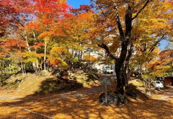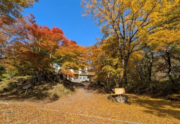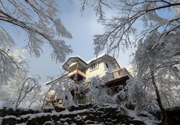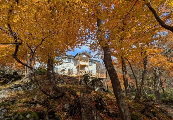 秋にはペンションがすっぽりと鮮やかな紅葉の中に包まれます。