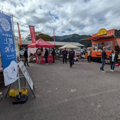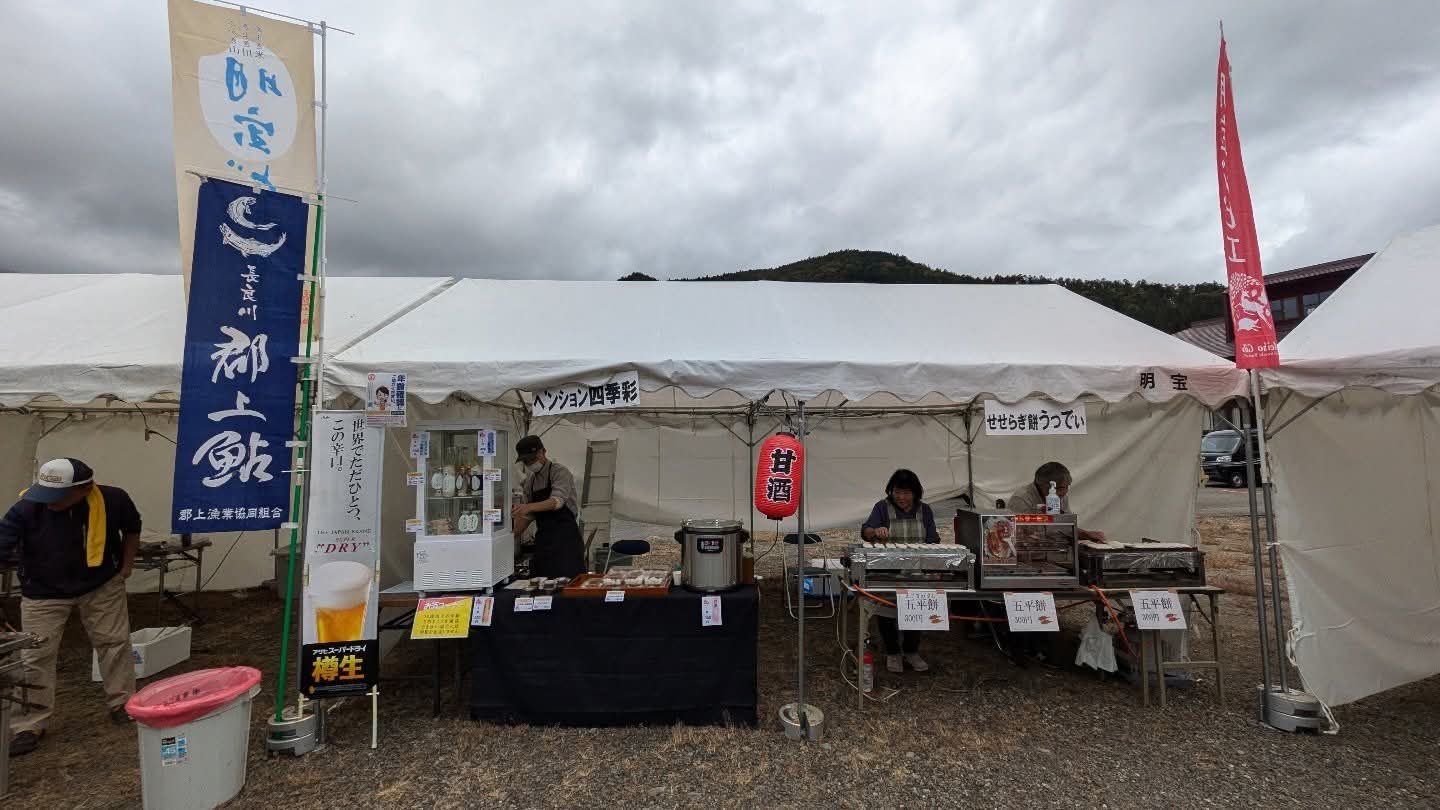 めいほう高原秋まつり2024でどぶろくと甘酒を販売しました。郡上漁協の提供する郡上鮎や明宝ジビエ、四日市とんてきなどグルメコーナーは毎年人気で行列ができています。ステージイベントではFMGIFUの司会とタレントの皆さんが会場を盛り上げていました